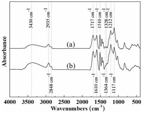The molecular structure changes of lignin were analyzed by FTIR spectroscopy. The FTIR spectra of the original enzymatically hydrolyzed lignin and modified lignin produced at 4 h are shown in Figure 3. The attribution of characteristic absorption peaks were identified according to Faix []. From Figure 3, some characteristic absorption peaks can be seen clearly, such as a broad band hydroxyl absorption peak (3430 cm−1); the C–H stretching vibration bands (2848 cm−1 and 2935 cm−1) from methyl, methoxyl, and methylene groups; the carbonyl groups (1717 cm−1); phenolic hydroxyl groups (1364 cm−1 and 1328 cm−1); aliphatic hydroxyl second characteristic absorption peak (1212 cm−1); the ether linkage (1117 cm−1); and C–H vibration (1510 cm−1 and 1610 cm−1) from aromatic rings. In order to determine the content of other functional groups, the peak area at 1510 cm−1 was set to 1.00 []. Some important functional groups were identified based on Equations (6)–(8) and listed in Table 2.