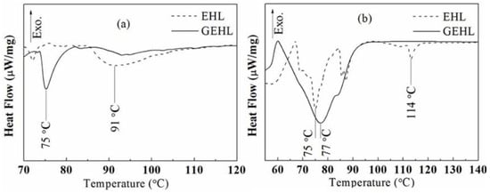 From Figure 4a, there is no obvious endothermic or exothermic peak in the DSC curve of EHL/PAPI sample. Only a small broad endothermic peak is found at 91.0 °C, which starts at 86.0 °C and has an offset temperature at 106 °C. Compared with EHL/PAPI sample, the sample of GEHL/PAPI shows a strong and narrow endothermic peak at 75.0 °C. From Figure 4b, the reaction peak from sample GEHL/epichlorohydrin is also stronger than EHL/epichlorohydrin reaction peak. Furthermore, there is an endothermic peak at 114 °C for the EHL/epichlorohydrin curve which can be explained by noting that a small amount of epichlorohydrin did not participate in the reaction and remained in the sample. On the one hand, due to the macromolecule aggregation effect, the hydroxyl groups were wrapped inside the particle of lignin, which prevented the reaction with the isocyanate group. On the other hand, the limited amount of hydroxyl groups on the original EHL may be another reason for the low reactivity. During the process of liquefaction and modification, the content of hydroxyl groups increased with the introduction of –CH2OH and the macromolecule aggregation effect was destroyed under the conditions of a strong base and heating.