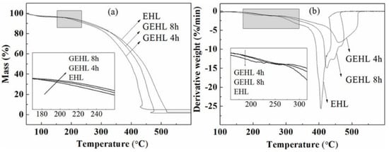 Figure 5 shows the (a) TG and (b) DTG curves of EHL and GEHL (GEHL4 and GEHL8) prepared using different reaction times. Some important parameters are summarized in Table 4. From the TG curves, there was a slight loss of mass for all lignin samples before 120 °C, which may be caused by evaporation of moisture or other small volatile molecules. At this stage, the mass loss rate (%/min) for all samples is between 2.5%/min and 3.5%/min. This phenomenon has also been reported by other scholars [].