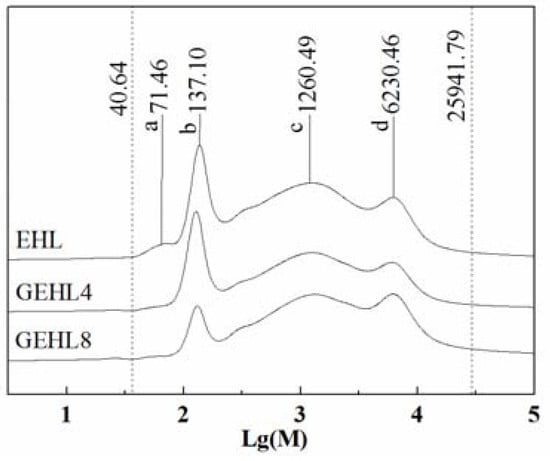Before the gel permeation chromatograph (GPC) test, the lignin samples were modified by acetylation according to the method used by Glasser and Jain [], which improved the solubility of lignin in tetrahydrofuran (THF) with almost no effect on molecular weights. In order to ensure lignin molecules disperse uniformly and stably in the solvent THF, the sample solutions (1 to 1.5 mg/mL) were stored for 24 h before testing. The number average molecular weight (Mn), weight average molecular weight (Mw), and molecular weight distribution (Mw/Mn) for EHL and GEHL were determined by an Agilent1100 model GPC, provided by Agilent Technologies Co., Ltd. (Santa Clara, CA, USA), equipped with a G1315B model UV detector and column combined with two 79911GP type columns. The test parameters were set as follows: testing temperature of 30 °C, an amount of injection of 50 μL with a flow rate of 1.0 mL/min, and a column pressure of 2.9 MPa. The columns were calibrated using polystyrene standards with different molecular weights, and the standard curve and fitting equation (Lg(M) = 10.60068 − 0.50533t) was obtained from the GPC system.