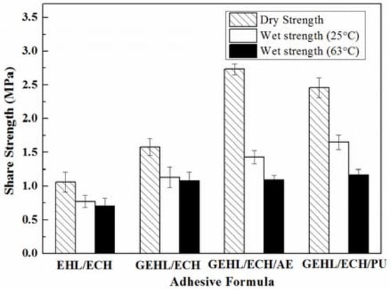 Epichlorohydrin can react with lignin and form a cross-linked network, which is the source of adhesive bond strength. Dry strength and wet strength of plywood based on lignin-based wood adhesives are shown in Figure 7. From the comparison between EHL/ECH and GEHL/ECH, it is clear that dry strength and wet strength of adhesive from GEHL was significantly higher than from EHL, which reached 1.58 MPa (dry strength) and 1.08 MPa (63 °C wet strength) for GEHL/ECH. These results indicate that the content of active groups and reactivity for GEHL increase significantly with the introduction of glyoxal.