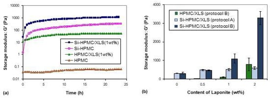 (a) Evolutions of storage modulus of different systems with time. Composite hydrogels were prepared using B. (b) Effects of XLS Laponites content on the final storage moduli of composite hydrogels prepared using different protocols after one day. Each data point represents mean ± SEM for n ≥ 3 samples.