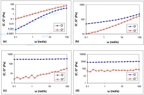 On the basis of the nature of their crosslinks, hydrogels can be classified as chemical hydrogels when the crosslinks are covalent bonds, or as physical hydrogels when the links are secondary weak bonds, such as Van der Waals, electrostatic interactions, hydrogen bonds, or molecular entanglements. It is possible to distinguish them from mechanical spectra. Figure 2 shows the frequency sweep results of different hydrogels prepared using B and tested after 24 h gelation at 37 °C.