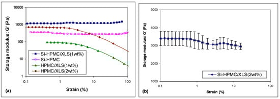 The critical deformation γ0 characterizing the limit of the linear viscoelastic region also allows for us to discriminate the different formulations. Figure 3 shows the strain sweep curves of different hydrogels that were prepared using B and tested after 24 h gelation at 37 °C. Both pure Si-HPMC and Si-HPMC/XLS composite hydrogels show steady value in the entire test range, meaning that the linear viscoelastic regime extends over 100% strain. On the contrary, the linear regime is limited to deformations below 1% for HPMC/XLS hydrogels, which is typical of weak physical gel structures [24]. Figure 3b shows the amplitude sweep curve of Si-HPMC/XLS composite hydrogel with 2 wt % XLS prepared using B. A slight drop of modulus is observed at about 3% strains, which lies in the same area as the critical deformation of the HPMC/XLS composite hydrogel.