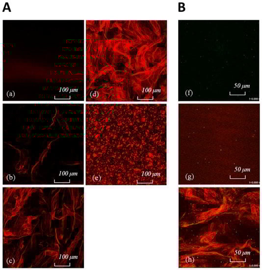 Figure 4b–d shows images of Si-HPMC/XLS composite hydrogels with increasing XLS contents. The images of HPMC/XLS composite formulations are similar to that of the silanized ones (data not shown). As Laponite is well dispersed in the aqueous solution and the dimension of a single particle is less than 50 nm, nothing can be observed under CLSM, as shown in Figure 4a, even though particles were labelled with fluorescent dye. When the Laponite was added to the hydrogel, XLS individual particles began to aggregate and turned to be visible. It can be seen from Figure 4b–d that the aggregated masses are in red as expected, but they are separated when the concentration of XLS is as low as 0.5 wt % (Figure 4b). When the content of XLS in hydrogels increased, the aggregated masses began to form a continuous physical network, as shown in Figure 4c,d. In contrary, using the protocol A no continuous physical network is obtained, but rather compact separated aggregates of Laponite (Figure 4e).
