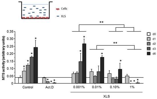 Methyl tetrazolium salt (MTS) activity of SW1353 cultured in two-dimensions (2D). (A) SW1353 viability was evaluated in 2D after adding 0–1% XLS, as indicated on top of the cell layer (10,000 cells/cm2). As described in materials and methods, a MTS assay was performed at day 0, 1, 2, 4, and 6. Negative control (Act.D) was obtained by growing SW1353 in the presence of actinomycin D (5 μg/mL). Statistics: * p < 0.01 vs. d0, ** p < 0.01 between the indicated groups.