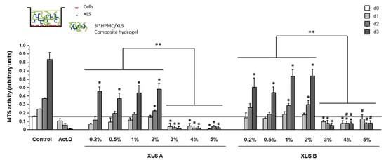 The MTS activity was also monitored in 2D with the cell layer in contact with the composite hydrogels (Si-HPMC/XLS). The results, which are plotted in Figure 7, showed a drastic decrease of MTS activity for Laponite concentration above 2%.