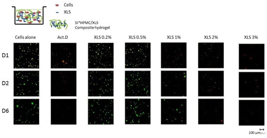 Following the 2D cytotoxicity assays evaluation, 3D cell proliferation was investigated (Figure 8). The confocal micrographs indicate a good viability of SW1353 cells cultured within Si-HPMC/XLS composite hydrogels up to 0.5 wt %. When cells were cultured in the presence of actinomycin-D or with high % of Si-HPMC/XLS composite hydrogels up (1% and above), dead cells are observed. These results evidence that at low concentrations of XLS (below 1%), the nanocomposite hydrogels have no negative effect on cells proliferation.