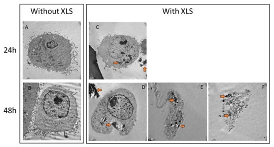 TEM micrographs of SW1353 cultured during one or two days into Dulbecco’s modified Eagle’s medium (DMEM) media containing XLS (C–F) or not (A,B). SW1353 fate was evaluated at 24 h (A,C) and 48 h (B,D–F). The samples were fixed, embedded, cut, and contrasted, as described in materials and methods. Aggregates of Laponites, appearing in black on TEM pictures (orange arrow), are internalized by cells and vesicles can be observed at 48 h. Scale bars correspond to 1 μm (A,B,D,F) and 2 μm (C,E).