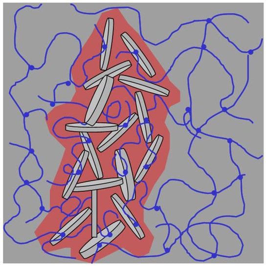 Illustration of possible double-network structure in silanized hydroxypropylmethylcellulose (Si-HPMC)/Laponite composite hydrogel. The curve line represents Si-HPMC polymer chain, the little plates represent Laponite and the round dots represent crosslink point where silanol condensation occurred. The silanols come from both Si-HPMC and Laponite. As Laponite has been dyed by Auramine O, the compact mass composed of aggregated Laponite and entangled polymer chain is in red under CLSM. It is likely that the XLS aggregates are more random than purely edge-faces contacts.