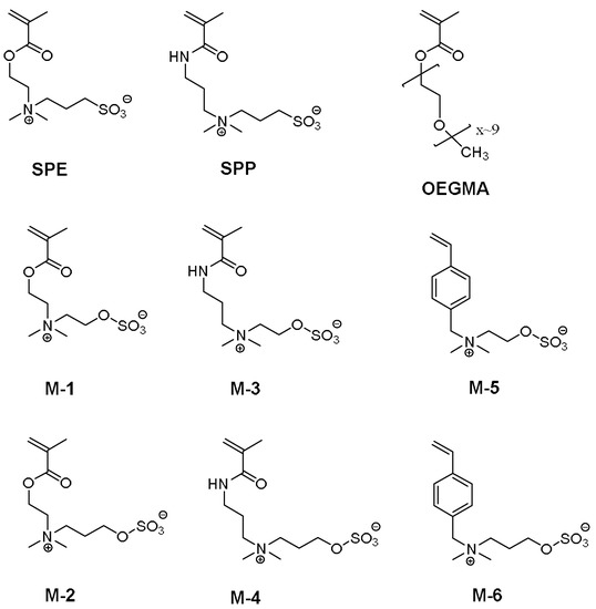 Chemical structures of the zwitterionic sulfobetaine (SPE, SPP)- and sulfabetaine monomers (M-1 to M-6) used, and of the reference monomer OEGMA.