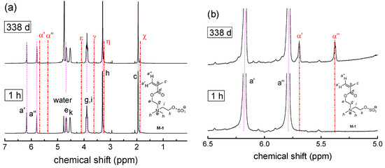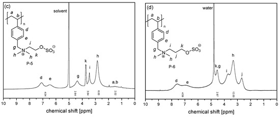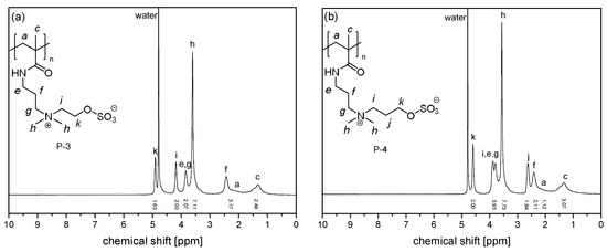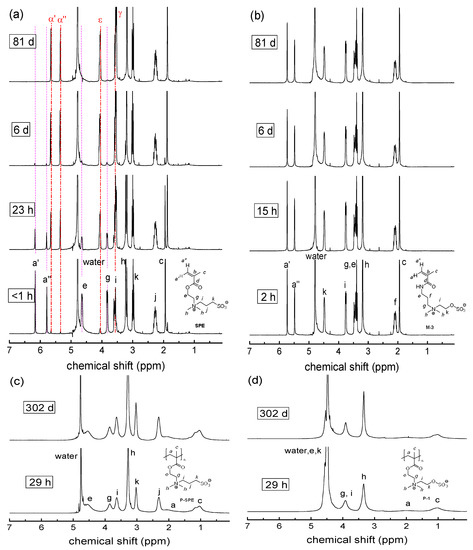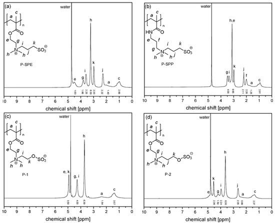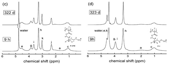 Initial spectra of the intact monomers and polymers were recorded in D2O (pH~5.8) prior to the ageing experiments, to which the necessary amounts of NaCl were added to achieve solubility at 22 °C (Figure 2 and Figure 3). Only in the case of polysulfabetaine P-5 that was insoluble even in saturated brine, the reference spectrum was recorded in deuterated TFE (Figure 3c). Despite the broad peaks and the limited resolution, all signals can be easily attributed to specific protons by comparison with the monomer spectra as well as with literature reports [47,54,56,60]. Note that for the methacrylic polymers P-OEGMA, P-SPE, P-SPP, and P-1 to P-4, the shape of the signal group between 1.5 and 0.7 ppm—that is characteristic for the methyl group on the polymer backbone—informs about the polymers’ tacticity [61], indicating that syndiotactic triades prevail in the samples, while the amount of isotactic triades is very small. This distribution of triades is typical for such polymers when made by standard radical polymerization in solution [54,56].