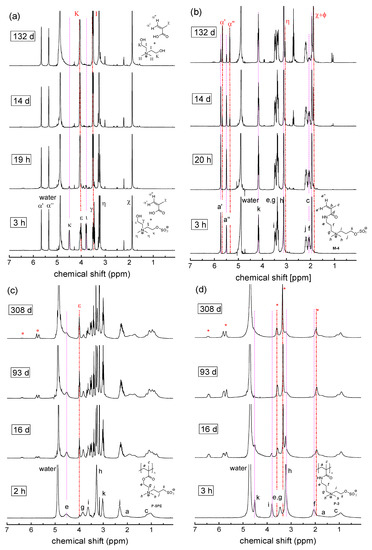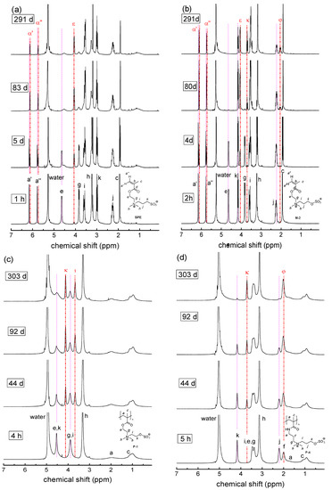 Evolution of the 1H-NMR spectra over time illustrating the degradation behavior in 1 M hydrochloric acid (DCl in D2O, pH = 0) at room temperature for: (a) SPE; (b) M-2, (c) P-1; (d) P-4. Signal attributions of the starting compounds are labeled by roman letters, signal attributions of the degradation product by corresponding Greek letters (cf. Figure 4). Broken vertical lines are meant as guide to the eye.