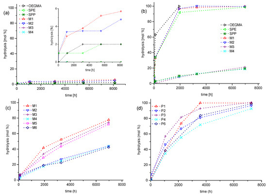 Comprehensive studies on the stability of antifouling polymers are missing, especially those covering long durations. Therefore, we investigated the hydrolytic stability for a set of six sulfabetaine and two sulfobetaine homopolymers, which are typically employed for antifouling studies. The chemical structures of the respective monomers are displayed in Figure 1. Degradation of these polymers in aqueous solution was studied over a period of up to one year at different pH values, and compared with the behavior of their monomers. As reference, we included the non-ionic homopolymer of an (oligoethylene glycol) methacrylate macromonomer, as such polymers have been widely used to implement antifouling behavior [2,10,44,45]. In addition to the most frequently used polysulfobetaines P-SPE and P-SPP, whose monomers are commercially available, we have also studied a series of polysulfabetaines, which are distinguished from the former polyzwitterions by the hemisulfate group forming the anionic sites instead of the sulfonate group [20]. The particular interest to include the large set of polysulfabetaines in our study arose from recent claims that this previously hardly studied polymer class [39,46,47,48,49,50] excels with respect to their stability against hydrolysis [46,48]. To keep the number of experiments manageable, the study was performed at room temperature, which seemed a reasonable choice in view of most outdoor applications. The stability of the various compounds against hydrolysis was followed by 1H NMR spectroscopy of aqueous solutions as a function of their contact time. Solutions were prepared with precise pH values, namely 0, 7.4, 10, and 14. When necessary, a defined amount of NaCl was added to decrease the upper consolute boundary to below 22 °C, as many of the polyzwitterions studied exhibit a high upper critical solution temperature (UCST) in pure water that is effectively reduced by added electrolytes [51,52,53,54].