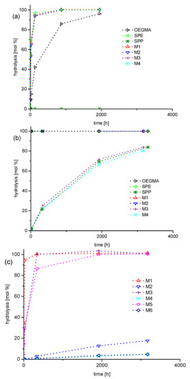Surprisingly, the stability of antifouling polymer coatings against degradation by water is seldom considered [13,14]. Although occasionally concerns are expressed, they are mostly discussed on the basis of common wisdom rather than of experimental facts. Accordingly, polymers with all-carbon backbones are preferred, avoiding the risk of backbone hydrolysis [15,16,17]. For such vinyl and vinylidene polymers, it is generally assumed that polymers connecting the functional side groups by ester moieties to the backbone (such as poly((meth)acrylates)) are considerably more sensitive to hydrolysis than analogs bearing amide moieties (such as poly((meth)acrylamides)), and much more than derivatives of polystyrene or poly(diallylammonium) compounds [18,19,20,21]. Also, it is generally accepted that hydrolysis is accelerated by increasing temperature, as well as by acidic or basic conditions. Still, particularly for the most widely employed antifouling polymers that bear oligo(ethylene glycol) or zwitterionic moieties in their side chains, experimental studies on their hydrolysis are scarce [22,23,24,25,26]. Moreover, they consider typically short periods only, that is, a few days at most. The majority of the systematic studies seem to have been conducted on the hydrolytic stability of the underlying monomers [27,28,29,30,31], but not on the polymers, assuming tacitly that the difference would be small. Accordingly, the literature assessments of the stability of antifouling polymers often represent mere assumptions, or are based on singular observations for which the precise experimental conditions are often not disclosed. According to the data available, polyacrylates seem to be rather susceptible to hydrolysis, much more than polymethacrylates [32,33,34,35,36,37]. Moreover, for the case of the monomers, methacrylamides were shown to resist hydrolysis better than methacrylates do [28,29]. Still, hydrolysis of both zwitterionic polymethacrylates and polymethacrylamides was noted occasionally [38,39]. However, the pH value of the reaction media remained unclear, and whether the hydrolytic degradation encountered in the final polymers took place at the polymer level, or on the monomer level prior to incorporation into the polymers. Note that, at least under basic conditions, pyridinium and benzylammonium moieties may also suffer degradation in aqueous media [40,41,42]. Further, studies on a set of zwitterionic (meth)acrylic systems revealed that 3-ammoniopropanoate derivatives are prone to degradation [14,29,43], presumably by elimination of a tertiary amine of these Mannich-base type compounds.