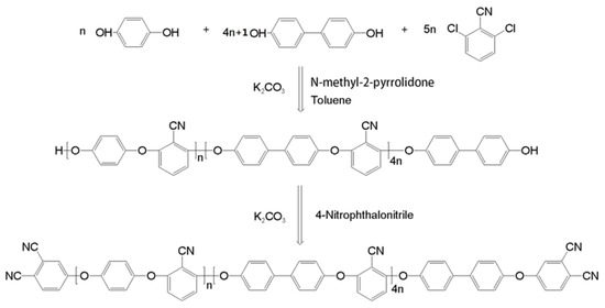 N-methyl-2-pyrrolidone (NMP) and toluene were purchased from Tianjin BODI Chemicals, Tianjin, China. Hydroquinone (HQ), biphenol (BP), 2,6-dichlorobenzonitrile (DCBN), and K2CO3 were supplied by Alpha Chemicals Co. Ltd., Dezhou, China. The phthalonitrile end-capped polyarylene ether nitrile was synthesized through a two-step, one-pot method. Firstly, the hydroxyl end-capped polyarylene ether nitrile (PEN-OH) was synthesized from HQ, BP, and DCBN by nucleophilic polycondensation reaction in the presence of K2CO3 as catalyst, NMP as polar solvent, and toluene as dehydrating agent. Secondly, the PEN-OH was end-capped by the 4-nitrophthalonitrile to obtain the PEN-Ph [16]. Then, the obtained PEN-Ph mixture was poured into a beaker filled with butanone to remove small molecules and then filtrated to retrieve the PEN-Ph powder. Finally, the PEN-Ph product was purified with dilute HCl solution, deionized water, and alcohol until the solvent and small molecules were washed away completely, and then dried at 120 °C overnight. The detail of the synthetic route of the PEN-Ph is shown in Figure 1.