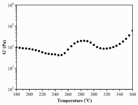 The physical and chemical changes of the polymers can be reflected efficiently through rheological testing. In order to investigate the properties of the PEN-Ph, rheological testing was employed. Figure 2 shows the rheological curve of temperature scanning in the range of 180 °C to 360 °C. A slight decrease of the storage modulus (G’) at the temperature of about 200 °C is mainly caused by chain segment motion, and this temperature is the glass transition temperature, which is determined from the volume changes during heating of the PEN-Ph systems [17,18]. When the temperature rises to about 250 °C, G’ starts to trend upwards. The first increase of G’ is mainly due to the formation of the PEN-Ph crystals. Then, the G’ trend declines with temperature increase to about 290 °C, which is caused by the PEN-Ph crystals melting and the sliding between the polymer chains when the temperature increases while the crosslinking process is not activated. As the temperature further increases, the G’ increases once more. The second increase of G’ is mainly caused by the crosslinking reaction among the PEN-Ph to form a network structure. These results proved that the PEN-Ph possesses a crosslinking reaction combined with crystallization behavior.