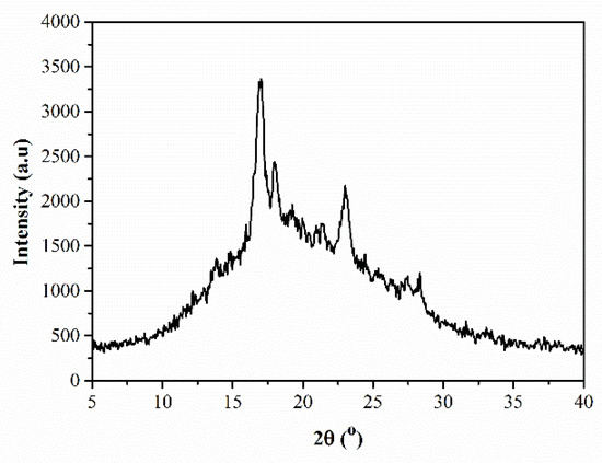 From Figure 1, it can be seen that the PEN-Ph main chain has a certain degree of regularity, leading to the crystallization behavior of PEN-Ph. The crystallization behavior of PEN-Ph could be further investigated using XRD, and the result is shown in Figure 3. The measured PEN-Ph sample was prepared through the hot-pressing method at 300 °C under 10 MPa for 4 h. From the XRD pattern, it can be clearly observed that there is a steamed-bun-like peak in the range of 10–30° which is attributed to the amorphous background resin. Furthermore, there are three obvious diffraction peaks in the curve at 17.0°, 18.2°, and 23.3°. The presence of these three obvious diffraction peaks proves the existence of PEN-Ph crystals. Moreover, the crystallinity is calculated to be 18.2% through peak-differentiating and imitating. These results provide evidence of the crystallization in the PEN-Ph system.