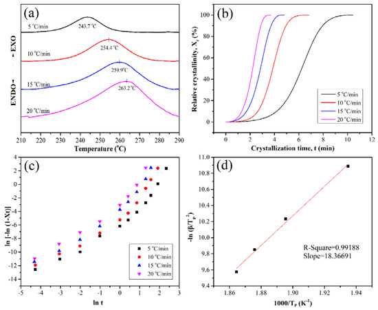 Figure 4a depicts the DSC curves of the PEN-Ph with different heating rates. It can be seen that all the curves have a cold crystallization peak in the range of 210 °C to 290 °C. With the heating rate increasing, the crystallization peak temperature (Tp) increases from 243.7 °C to 263.2 °C. The shift of the cold crystallization peak is mainly due to the fact that the polymeric molecular chain is a peristalsis process of chain segments which is driven by diffusion during the crystallization process [25].