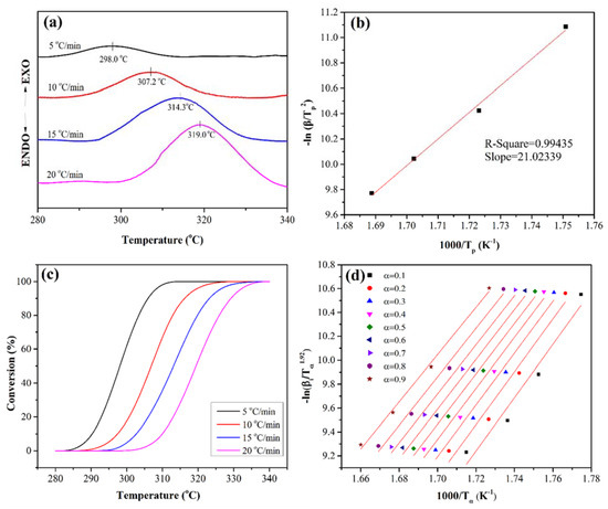 Figure 5a shows the DSC curves of the PEN-Ph under different scan heating rates. It can be clearly observed that there is an exothermic peak in the range of 280 °C to 340 °C in all the DSC curves. This exothermic peak is caused by the crosslinking reaction of the phthalonitrile at the end of the PEN-Ph chain. With the heating rates increases, the exothermic peak shifts to a higher temperature and the enthalpy of the exothermic peak increases. This is mainly due to the fact that the polymeric molecular chain is a peristalsis process of chain segments which is driven by diffusion during the crosslinking process.