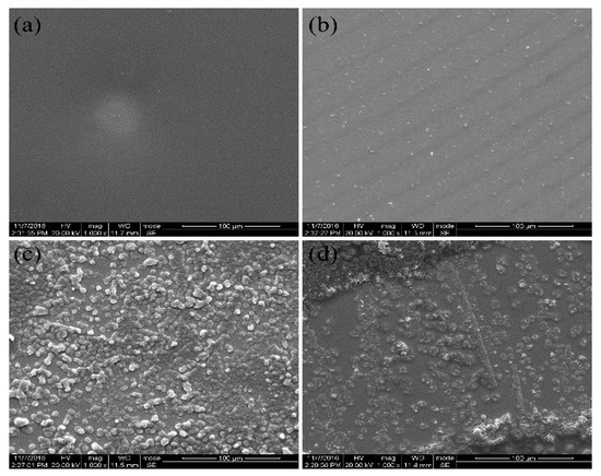 SEM of the process of growth of the PEN-Ph crystals at 280 °C. (a) 0 min; (b) 10 min; (c) 30 min; (d) 60 min.