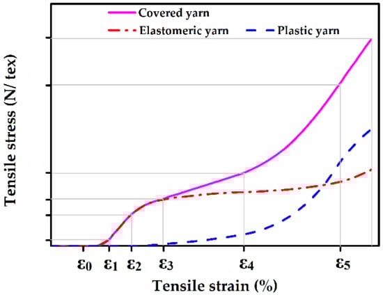 Stress-strain curves of a covered yarn with elastic core and covering yarns. Images adapted and reproduced with permission from Reference []. Copyright SAGE Publications 2012.