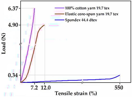 The mechanical properties of elastomeric core-spun yarns were significantly affected by spandex and the outer yarns. Figure 2 shows the load-elongation curve of the 100% cotton yarn (19.7 tex), the spandex (44.4 dtex/4f), and the elastomeric core-spun yarn (19.7 tex) []. It was found that the elastomeric part of core-spun yarns such as spandex did not contribute much to yarn strength while a non-elastic part of core-spun vortex yarns restricted the stretch limit of core-spun yarns [].