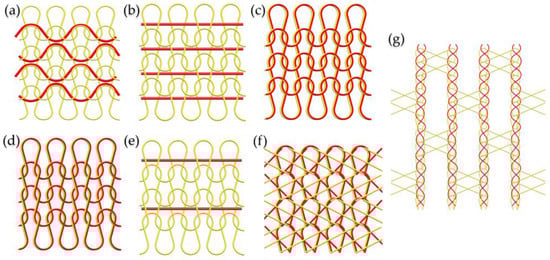 Typical knitting construction for elastic fabrics (red line is elastic yarn and yellow line is ground yarn): (a) Elastic yarns are as laid-in stitch in jersey. (b) Elastic yarns are as weft inlay stitch in jersey. (c) Elastic yarns are as plating stitch in jersey. (d) Elastic yarns are as plating stitch in rib, (e) Elastic yarns are as weft inlay stitch in jersey. (f) Elastic yarns are knitted on the back bar with 1–0/1–2// tricot stitch. (g) Elastic yarns are as laid-in stitch to produce power-net construction.