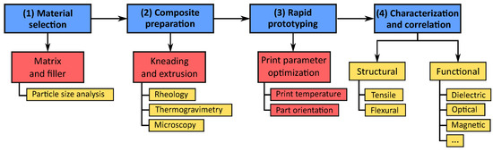 The process starts with the selection of the matrix material and a functional filler. The matrix material could be a thermoplastic for FDM or an acrylic monomer for SL, whereas the filler could be a metal, ceramic, semiconductor or any other functional material. The materials have to be stabilized and homogenized before being characterized for their material properties, such as rheology, thermogravimetry, calorimetry or microscopy. The material properties can then be adjusted to work within the boundaries of the ARP process through additives and agents. The third phase is the production of test samples, followed by their structural and functional characterization. The results obtained can then be correlated back with existing theoretical models for composite materials. This four-phase process can be adapted to work with other ARP technologies by employing the appropriate processing and characterization methods.