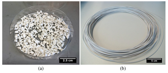 (a) A photo of the ABS-BT feedstock after kneading. (b) An ABS-BT composite filament sample.