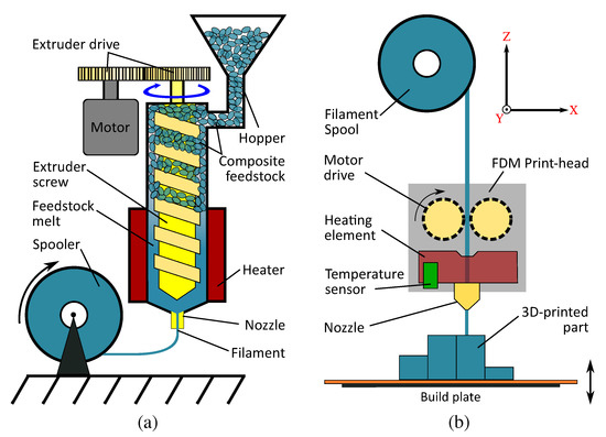 (a) A schematic depiction of the filament extrusion process. The kneaded composite material chunks are forced down a heated barrel using a screw, extruded through a nozzle of a defined diameter and spooled. (b) The FDM printing process: A motor drive forces the filament into the temperature-controlled print-head, mounted on an XY stage. After being forced through a nozzle, the material is deposited on to a build plate, which moves down to allow for the structuring of the next layer.