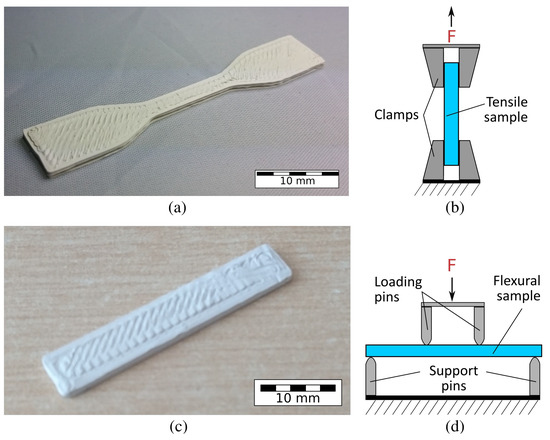 Tensile specimens were based on the ASTM-D638 (Type IV) standard, with dimensions (L) 57 mm × (B, center) 3.5 mm × (H) 1.5 mm. Figure 4a,b shows a tensile specimen and a schematic of the tensile testing process, respectively. The samples were tested until failure to investigate the effect of the ceramic filler on the ultimate tensile strength (UTS) and the Young’s modulus of the composites.