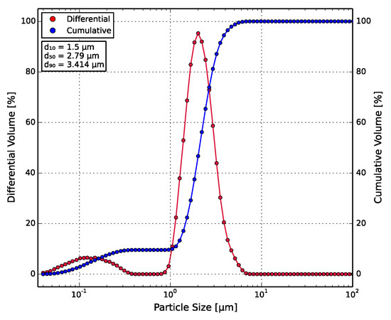 Particle size distribution of the BT particles, with red the differential and blue the cumulative volume. The particle distribution is bimodal, with the value lying at 2.79 μm.