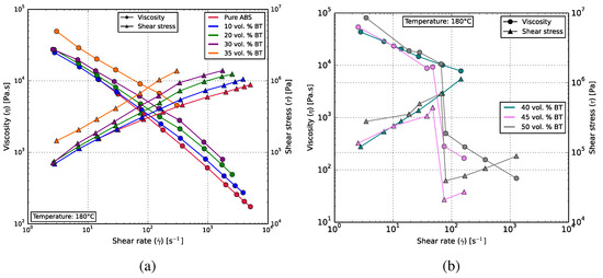 Figure 7a shows the rheological behavior of the composites that could be 3D printed. Pure ABS, as well as the composites exhibit a non-Newtonian shear-thinning characteristic, with the BT content impeding the rate at which the dynamic viscosity decreases with increasing shear rates.