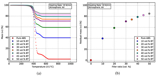 The remaining ceramic masses for all composites (Figure 8b) correlate well with theory, since the density of BT (6.02 g/cm) is around six-times that of ABS (1.04 g/cm). The theoretical and measured values are indicated in Table 2 and lie within the error margins of the measurement device.