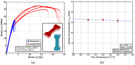 The UTS of pure ABS was found to be at around 40% of the manufacturer-provided values (65 MPa for Terluran®GP-22). When compared to 3D-printed ABS specimens from the literature using similar print parameters [30,58,59], the results are comparable (20, 32.6 and 16 MPa, respectively).