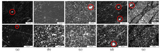 Microscope images of tensile test specimen cross-sections of (a) pure ABS, (b) 10 vol %, (c) 20 vol %, (d) 30 vol % and (e) 35 vol % at (top row) 20× and (bottom row) 50× zoom. Some visible voids have been marked with red circles.