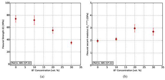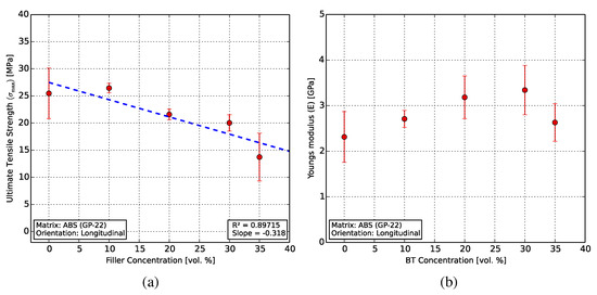 Results from the tensile characterization. (a) A linearly decreasing UTS () with increasing BT filler concentration was observed from 25.5 to 13.7 MPa. (b) The Young’s modulus of the composites showed a slight increase compared to that of ABS.