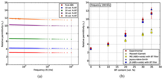 The relative permittivity of the composites was seen to increase with increasing BT filler ratio while decreasing logarithmically with frequency, as shown in Figure 13a. At 200 kHz, the ABS-35 vol % BT specimens showed a mean of 11.5. These values are equal to or better than those of a recent study [11] of the behavior of 3D-printed ABS-BT composites in the GHz regime. A further increase in the filler content and measurements at higher temperatures will predictably exhibit higher permittivities.