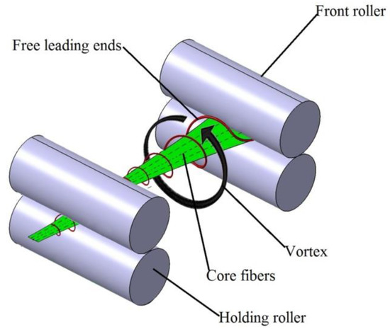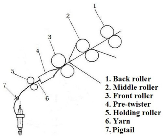 The model of the modified ring spinning system is shown in Figure 1. Compared with the conventional ring spinning system, a pre-twister and a holding roller were added to the system, which is also different from the former researchers [21,22,23,24,25] whose purposes were reducing yarn hairiness with an air-jet and without a holding roller.