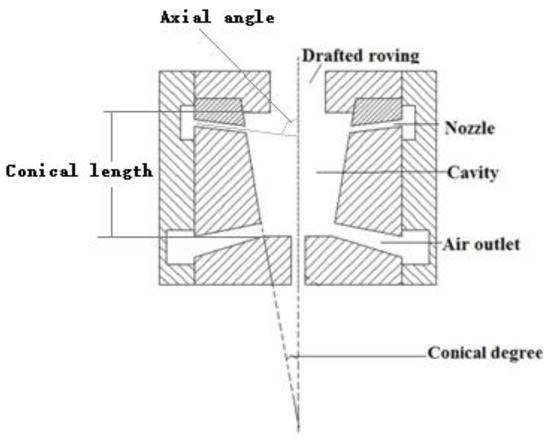 The basic geometry of the pre-twister is a cavity with 4 nozzles as shown in Figure 2. The cavity shape is conical with 6 mm length. The nozzles are conical in shape with 0.8 mm × 0.6 mm diameter and 2 mm length connected to the cavity wall. The axial angle α is the angle between the nozzle axis and the cavity axis and the tangential angle β is the angle between the nozzle axis and the cavity wall. The conical degree of the cavity and the axial angle, tangential angle, and number of nozzles were selected as geometry design parameters for computation. Nine geometries of the pre-twisters were chosen, as given in Table 1.