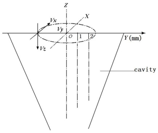The characteristics of the airflow in the pre-twister for each case in Table 1 were simulated, and are shown in Figures 7–10. The air field can be described with the airflow trace and its velocity which will directly influence the wrapping effect of the pre-twister. The air velocity is resolved into three components, viz., tangential velocity (Vx), radial velocity (Vy), and axial velocity (Vz), as shown in Figure 6. Wrapping action is created by the tangential and axial velocity components of the air velocity. The total width of the drafted fibers emerging from the front roller nip is 2~4 mm (varied by the roving count), so the distance from core to marginal fiber is 1~2 mm. Thus, on the radial direction along the axis 1 and 2 mm away from it, the tangential and axial velocities from inlet to outlet are discussed.
