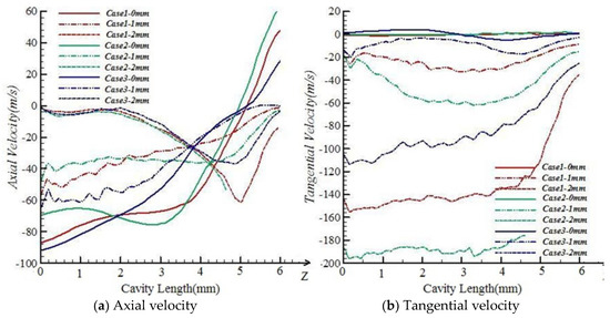 Figure 9 shows that among different cases, the variations in axial and tangential velocities in the cavity caused by the nozzle tangential angle β are similar to the conditions of the nozzle axial angle. When close to the fiber inlet, the axial velocities are all about 85 m/s.