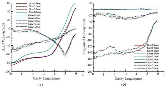 Velocity comparisons among Case1, Case 6, and Case 7. (a) Axial velocity; (b) tangential velocity.
