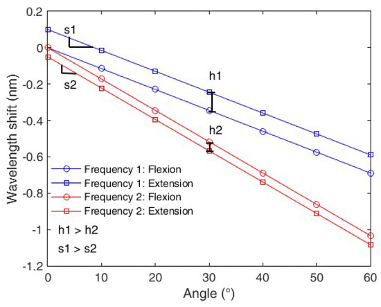 The expression presented in Equation (4) shows the sensor sensitivity with respect to the curvature (represented by x). As can be seen in Equation (4), the Young’s modulus variation leads to a variation in the sensor curvature sensitivity. Additionally, the Young’s modulus presents a linear variation with respect to the frequency, which leads to a sensitivity reduction of the POFBG sensor when the frequency increases. Such a Young’s modulus variation is characterized as a function of the movement frequency in Section 4. In addition, the polymer viscoelastic response also can show a dependency with the applied strain rate, which explains the relation between hysteresis and angular velocity reported in [8]. Thus, the angular velocity and, consequently, the frequency can influence both the sensor sensitivity and hysteresis, which is defined as the offset between the loading and unloading curves. The reason for this frequency dependency is related to the polymer relaxation, where in low frequency the polymer will present a higher degree of relaxation that results in higher sensitivity and hysteresis. In the curvature case, the loading curve will be referred to as the flexion cycle, whereas the unloading as the extension cycle. Figure 1 summarizes the effect of the oscillatory movement frequency on the sensor’s response. It is worth noting that Figure 1 illustrates the frequency effects that will be experimentally confirmed in the next sections. The sensitivity is the slope of the curve relating wavelength shift and angle. Thus, the frequency influence on the sensor sensitivity is represented by a slope variation; whereas the hysteresis is shown as an offset for the measurements made at the two different frequencies, where the hysteresis is defined as the difference between the flexion and extension cycles of the sensor [12]. Referring to Figure 1, s1 and s2 are the sensitivities for frequency 1 (f1) and 2 (f2), respectively. Additionally, h1 is the hysteresis at f1, whereas h2 is the one at f2. In the case presented in Figure 1, frequency 2 is higher than frequency 1. The simulated responses presented in Figure 1 are obtained through the application of Equation (4) for two different frequencies (f1 and f2) using the simulation parameters presented in Table 1, where the parameter x is the angular variation from 0° to 60°. In order to account for the hysteresis effects, two different offsets are applied in each curve (for f1 and f2). It is worth to mention that we estimate two offsets and two Young’s modulus, one for each frequency in order to obtain the hysteresis and sensitivity variation in the simulated responses for both cases and the actual values of the Young’s modulus and hysteresis are experimentally obtained in Section 4 through the DMA and curvature tests (at different frequencies), respectively.
