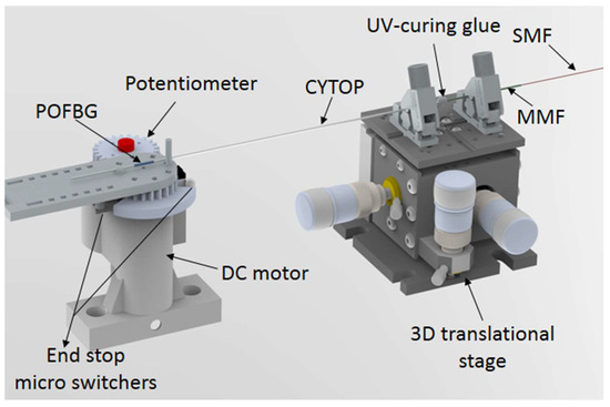 The developed POFBG sensor is positioned on the experimental setup showed in Figure 5. The setup comprises of a DC motor with angular position and velocity control, where a potentiometer is connected with the DC motor and a gear (1:1 ratio) to provide the reference angle. The tests are performed over an angular range of 0 to 60°, which is within the knee joint angle interval during gait motion when walking [9]. In addition, two end-stop microswitches are employed to prevent system angles exceeding 60°. The CYTOP and MMF are fixed in the 3D translational stage, for the purpose of providing higher stability for the UV-joint during the oscillatory movements. The movement frequencies that are employed are 0.50, 0.61, 1.10, 1.32, 1.87 and 4.49 Hz. These frequencies were selected as they are close to the ones used in the material Young’s modulus characterization with respect to the movement frequency and are within the frequency range of the human lower limb movement.
