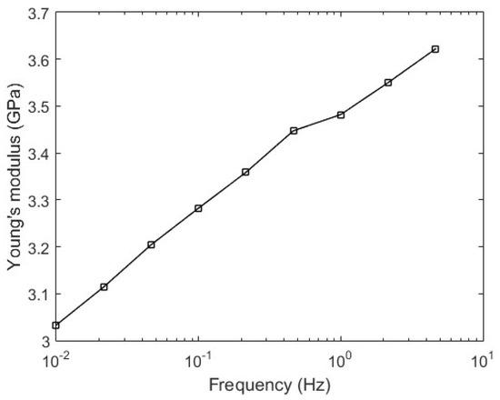 The first test is the fiber material characterization with respect to the strain cycle frequency. Figure 6 shows the obtained results, where there is an increase of the POF Young’s modulus with the increase in frequency. Thus, the angular velocity increase leads to a reduction of the sensor sensitivity (see Equation (4)).