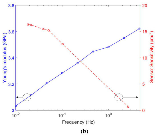 (a) POFBG curvature sensor response for three different frequencies (0.50, 1.32 and 4.49 Hz). (b) Comparison between the sensor sensitivity and Young’s modulus variations with respect to frequency.