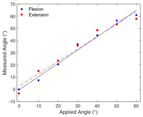 Additionally, as presented in Figure 8a, there is also a sensitivity variation between flexion and extension cycles, which is a source of hysteresis. Therefore, for the hysteresis compensation, it is necessary not only compensate the offset between the curves, but also the sensitivity variation. For the tested frequencies, the sensitivity of the flexion cycle is greater than the extension cycle. Figure 8c depicts the sensitivity difference between flexion and extension cycles at each frequency (0.50, 0.61, 1.10, 1.32, 1.87 and 4.49 Hz), and we observe a hysteresis-related, lower sensitivity for the sensor extension cycles compared to the flexion cycles.
