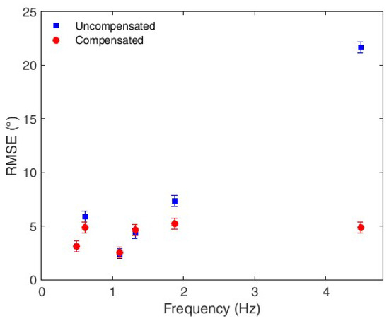 RMSE of the compensated and uncompensated responses at each tested frequency.